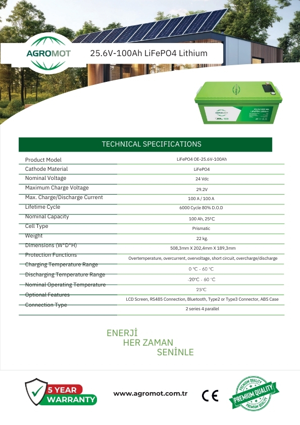 Agromot LiFePO4 Lityum Aküler, yenilenebilir enerji sistemlerinden bağımsız güç ihtiyaçlarına kadar geniÅŸ bir kullanım alanına sahiptir. Uzun vadeli enerji verimliliÄŸi ve dayanıklılığıyla güçlü bir enerji çözümü sunar.